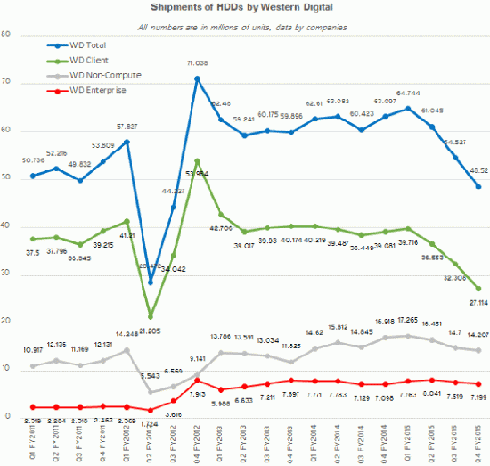 В четвёртом квартале финансового 2015 года (что соответствует второму кварталу календарного 2015) WD продала 48,52 миллиона жёстких диска, что существенно ниже продаж в 63,097 миллиона в тот же период год назад. Поставки HDD для серверов и некомпьютерных устройств незначительно поднялись, или слегка упали. Тем не менее, продажи жёстких дисков для клиентских ПК снизились на колоссальные 12 миллионов единиц по сравнению со вторым кварталом 2014 года.